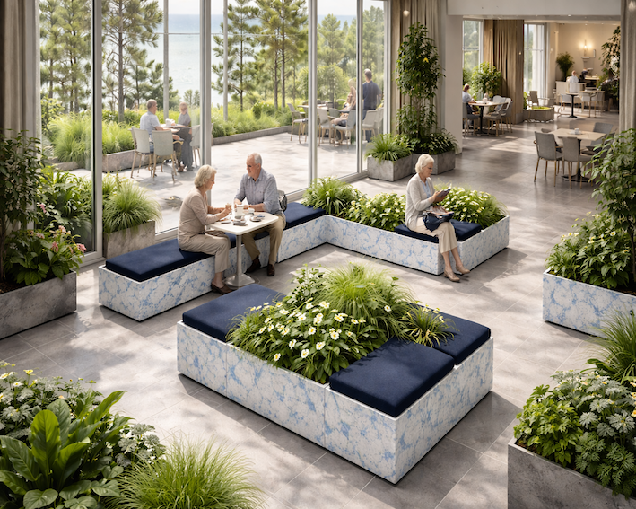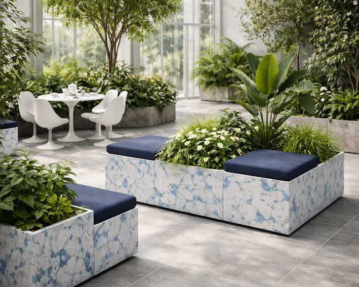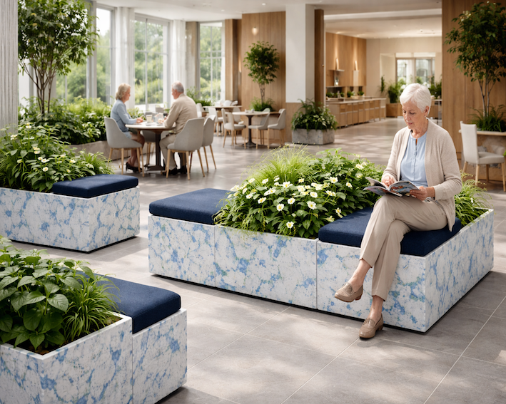 Det blå/hvide genbrugs plastmateriale giver en genkendelig, kultiveret reference, mens den mørkeblå filt tilfører varme, komfort og akustisk dæmpning. Sammen med planterne opstår et roligt og værdigt udtryk, der fungerer i både moderne og omsorgsprægede miljøer.