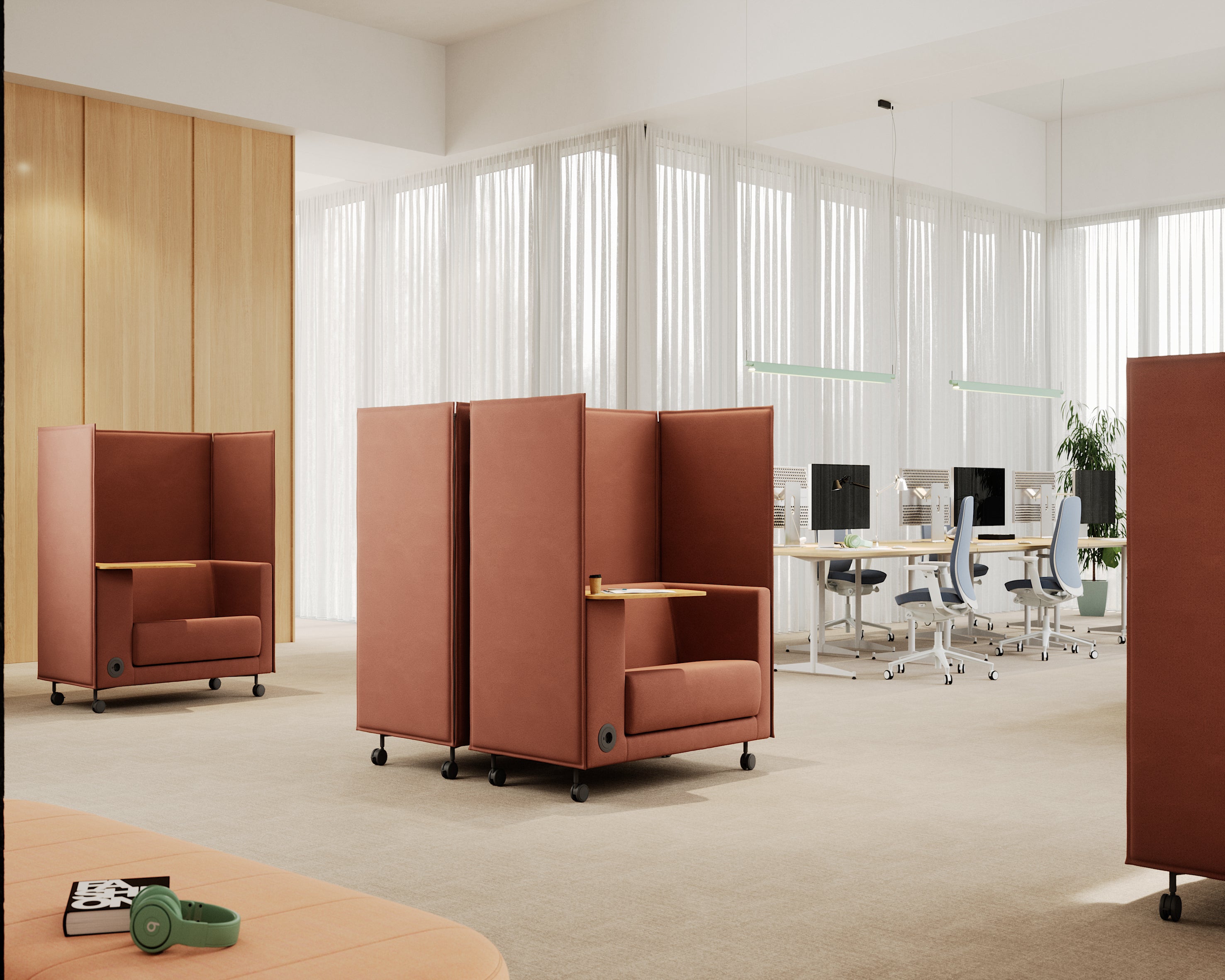 Arbejdssofa til åbne kontormiljøer og kontorhoteller, designet til koncentreret arbejde og uformelle møder. De høje, polstrede sider reducerer støj og visuel uro og skaber en afskærmet arbejdszone i ellers åbne rum.