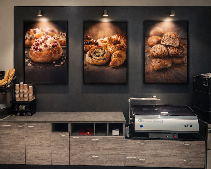 Ud fra billeder af din eksisterende butik viser vi, hvordan udvalgte områder kan opgraderes og fungere mere sælgende – visuelt og konkret. Små ændringer kan være mange penge værd. Bare et godt salg mere om dagen gør jo en forskel. Se eksemplet fra vægge i en bagerforretning og en væg på en restaurant - som viser situationen nu og som den eksempelvis kunne (burde) se ud. Begge mister dagligt salg.