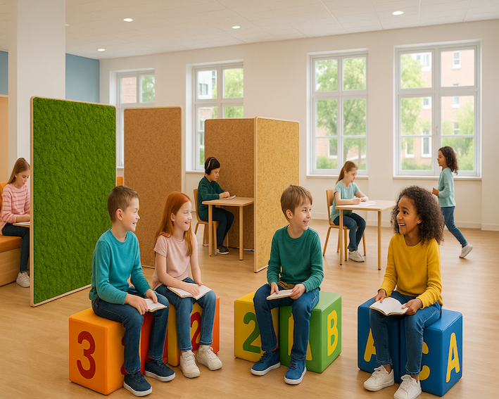 Vi gentænker skolens rum - eks. klasselokalerne så de bliver rolige, fleksible og inspirerende. Med akustikløsninger, bæredygtige materialer og zoner, der giver både ro, bevægelse og fællesskab, skaber vi rammer, der løfter hele skoledagen. Akustikpaneler, bløde fleksible TIQ læringsmøbler og naturlige teksturer reducerer støjniveauet markant og giver tydelig forbedret koncentration. Små fokusrum, loungeområder og fleksible moduler giver eleverne mulighed for at vælge den læringsstil, de arbejder bedst i. Træ, kork, genbrugsmaterialer og naturelementer skaber varme og personlighed – samtidig med at skolen kan fortælle en stærk grøn historie.