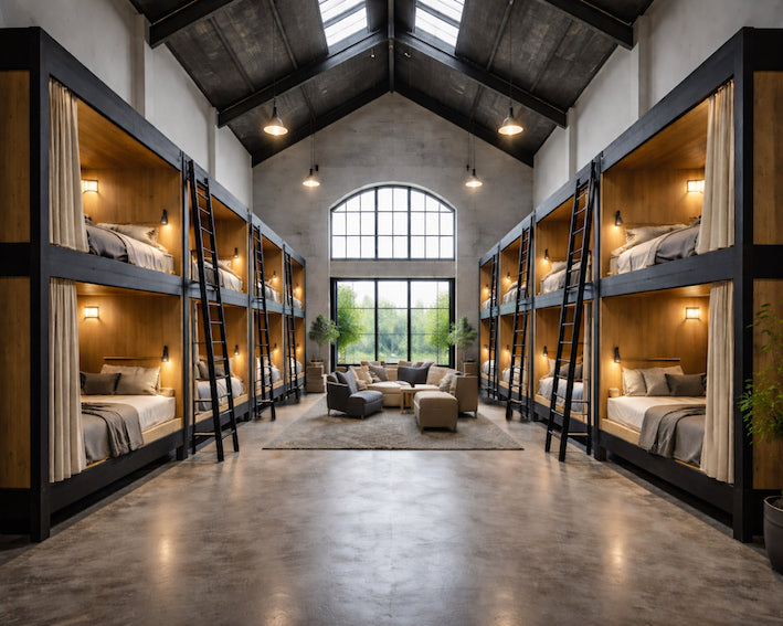 Vi hjælper ejere af landejendomme med at omdanne tomme lader, fabrikshaller mv. til små, rentable overnatningssteder – typisk med enkle sleeping pods og fællesfaciliteter.