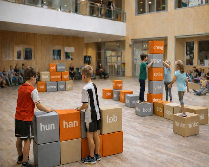 Konceptet er simpelt. I har som skole et eller måske flere af disse sæt stående som dobler som siddeklodser til brug i aulaen, læringscentret eller i projektrum. Læreren kan så tage sættet frem og lege dansk ind i undervisningen.