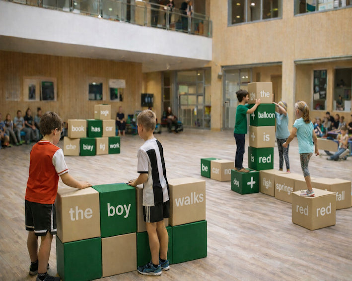 Konceptet er simpelt. I har som skole et eller måske flere af disse sæt stående som dobler som siddeklodser til brug i aulaen, læringscentret eller i projektrum. Læreren kan så tage sættet frem og lege engelsk ind i undervisningen.